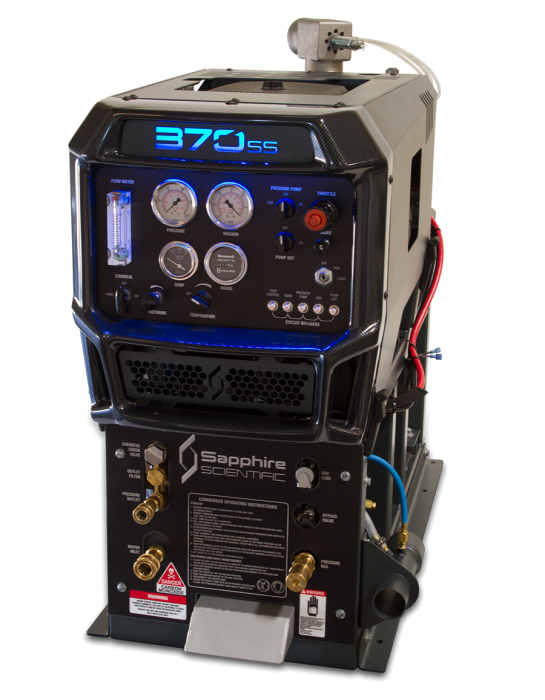 The AMAZING 2018 370SS – Sapphire's #1 bestseller – now has a hot new look with carbon fiber-style details and a backlit front bezel. The 370SS delivers everything that made it the cleaning industry favorite: the hottest water and more vacuum than the competition and the best overall performance in its class. And the 370's space-saving profile is half the footprint of other truckmounts. Clean carpets, upholstery, hard surfaces – even do flood extraction – this versatile machine does it all.
