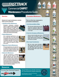 The Bridgepoint Commercial Carpet Maintenance Procedures Guide is a FREE step by step training tool that lays out a complete planned maintenance program. This four page guide walks the commercial cleaning technician through the procedures necessary for preventative maintenance, routine maintenance, appearance maintenance, restorative maintenance, and spot & stain treatment and removal. In each section, specific Bridgepoint chemistry is applied through a variety of cleaning equipment. Special procedures are outlined for various challenges encountered in the commercial environment including: normal soiling, heavy soiling, commercial olefin or triexta fiber, and wool carpet. It even outlines what procedures and chemicals to use for carpets that require cleaning with Carpet & Rug Seal of Approval products and Green Seal Certified products. A special hints and tips section highlights specialized chemistry available, and ways to increase speed and efficency in cleaning while reducing drying times. The procedures guide encompasses low moisture encapsulation cleaning, surface hot water extraction, and high performance hot water extraction cleaning. Download your free copy today below.