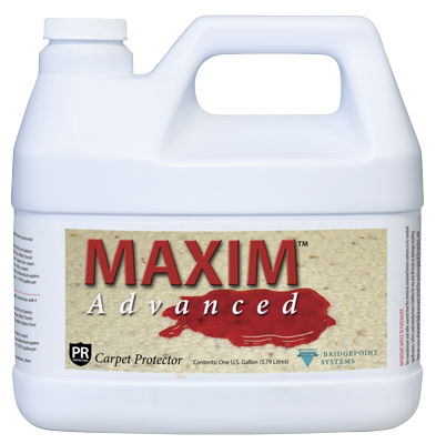 Maxim™ Advanced uses the latest technology to deliver the very best levels of protection available. Not only does it protect against oil and water based spills, as well as dry soils, it also protects fibers from the toughest dye stains "from the inside out"! In addition to providing extended coverage when compared to traditional protectors (1200 sq. ft. per gallon residential, 2400 sq. ft. commercial), it also only uses half the water, so carpets dry twice as fast!