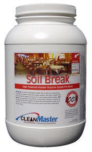 Soil Break an ultra-concentrated powder that is ideal for prespraying of restaurant carpets, automotive repair centers, and other carpets that are subjected to massive amounts of oil and grease based soiling. Unlike some enzyme presprays that are sensitive to alkalinity and extremely hot water, Soil Break contains a combination of enzymes that can be used in conjunction with your truckmount and high performance portable extraction equipment. This unique combination of enzymes works to accomplish the task in less time than with conventional enzyme presprays.