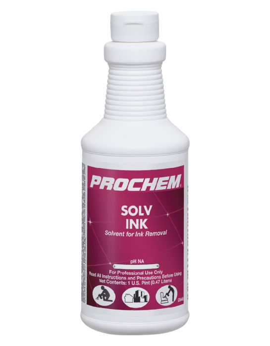 Prochem’s Solv Ink removes a wide variety of ink spots from carpet, upholstery, fabrics, and hard surfaces. Its high-tech 100% volatile solvent blend penetrates and lifts away most common inks. It has a pleasant scent with no strong solvent odor and is VOC compliant.
