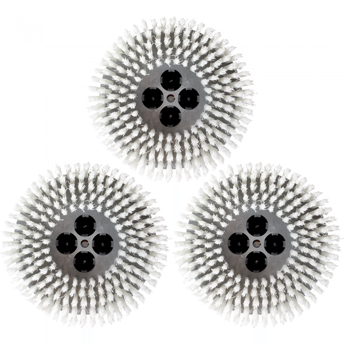 Pack of 3 economical white nylon brushes. These scrub brushes are safe for use on most surfaces. Available in both soft and stiff bristles. Soft bristles are gentle enough to use with Cimex Carpet Machines in encapsulation carpet cleaning. Stiff bristles offer more aggressive cleaning on hard floors with Cimex Scrubbers.
